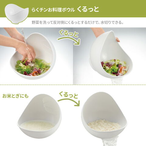 1台2役、らくチンお料理ボウル「くるっと」サラダを洗ったあと、逆側のスリットで水切りができて、そのままドレッシングで和えることもできます。