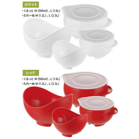 食材を入れてくるっと返せばボウルにもザルにもなる「くるっと(M&L)」と、電子レンジで調理できるフタつきボウルの「たれーぬ(M&L)」の4点セット。