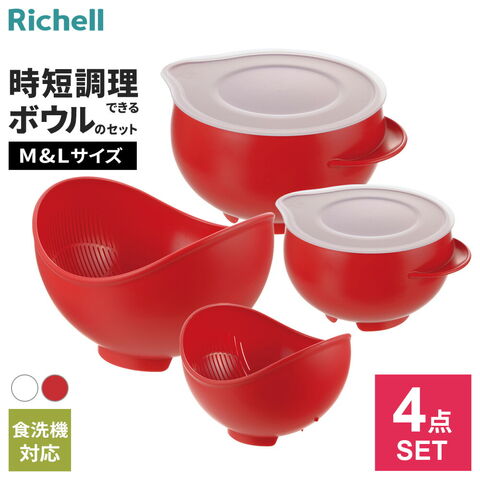 リッチェル らくチンお料理ボウル M+L セット (くるっと + たれーぬ)4点セット ホワイト | ボール ザル 2役 ざる ぼうる フタつき 片口 水切り 電子レンジ 調理 食洗機対応 米とぎ スープ 野菜 サラダ ソース 卵液 プラスチック 抗菌 シンプル キッチン用品 おしゃれ かわいい