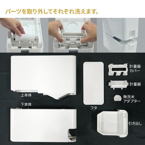 材質:本体/PP フタ・計量器・無洗米アダプター/PS 透明窓/AS樹脂 パッキン/シリコーンゴム クッション/発泡PE 脚ゴム/PE