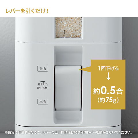 レバーを引くだけ!簡単計量レバーを1回下げると約0.5合(約75g)のお米が下の引き出しに入ります。※コメの種類や、精米の程度などにより誤差がありますので予めご了承ください。