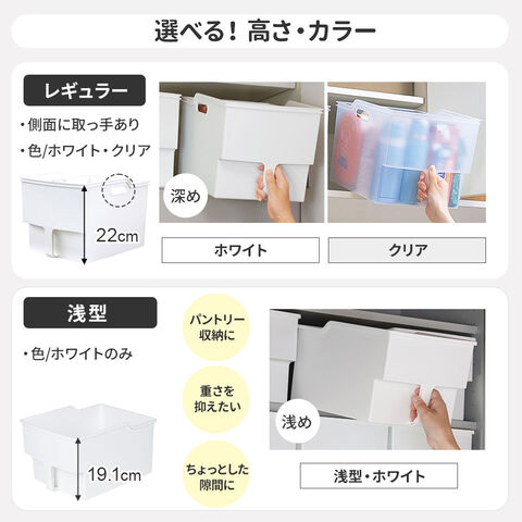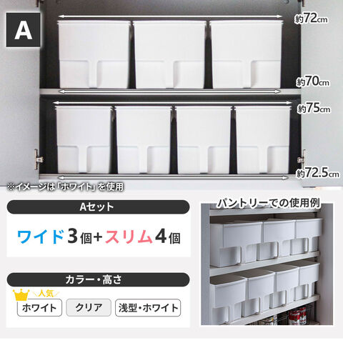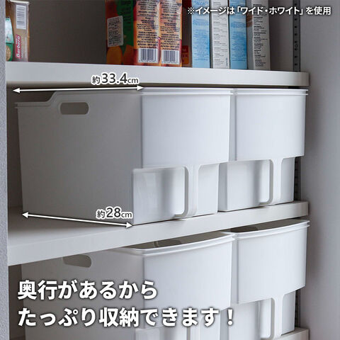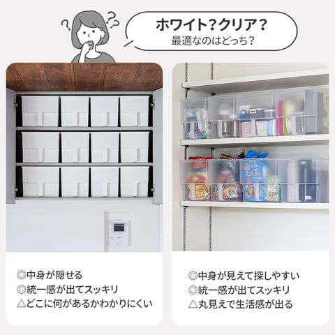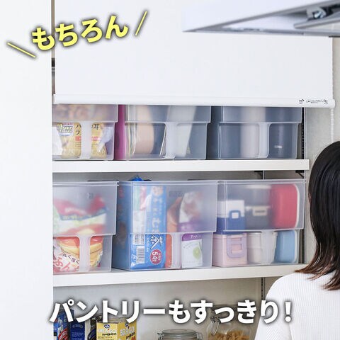 選べるカラー不透明なホワイトは、中身が隠せるので見た目にもスッキリ。見せる収納としてパントリーでも使用できます。