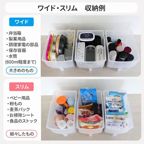 すっきり収納キッチン雑貨、お弁当箱や水筒のパーツなど収納物のサイズによってスリムとワイドを使い分けできて便利。