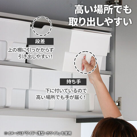 取り出しやすい前面の持ち手が下についているので、高い場所でも引き出しやすくなります。