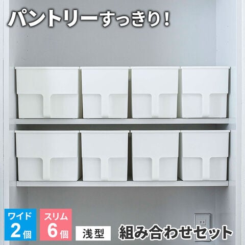 キッチン収納 吊り戸棚ボックス 浅型 まとめ買いセット ワイド・スリム ホワイト 8個セット ( ワイド浅型2個 + スリム浅型6個 ) | 吊り戸棚収納ボックス 収納ケース ストッカー ボックス 取っ手付き 持ち手付き 吊戸棚 パントリー 整理ボックス 戸棚 収納 食器棚 台所収納 プラスチック