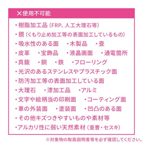 使用前は目立たない部分でキズがつかないか試してから使用し、汚れを落とした後は必ず水で洗い流すか水拭きをして仕上げてください。