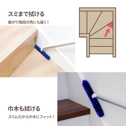 カーブや狭い場所もおまかせ棒状のモップなので、螺旋階段のようにカーブしている階段の角や、巾木の上にも使いやすい。