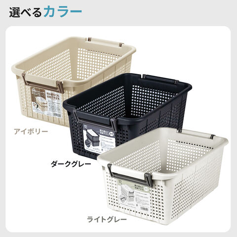 中身を収納したまま重ねてストックできる、プラスチック製バスケット。