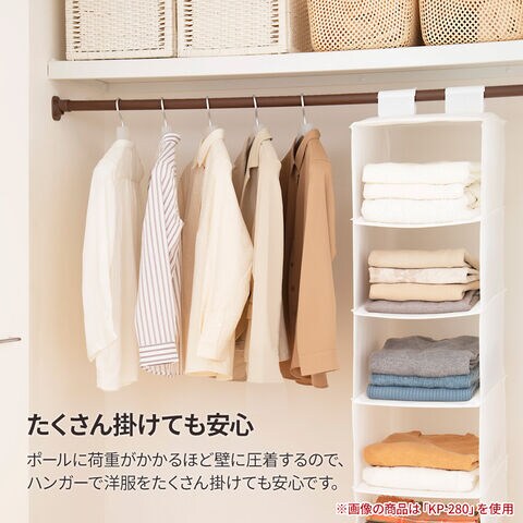 ポールに荷重がかかるほど壁に圧着するので、ハンガーで洋服をたくさん掛けても安心です。