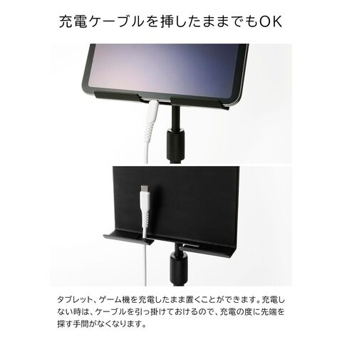 タブレットやゲーム機を設置したまま充電ができ、充電していない時にはケーブルをフックに引っ掛けておけて便利です。
