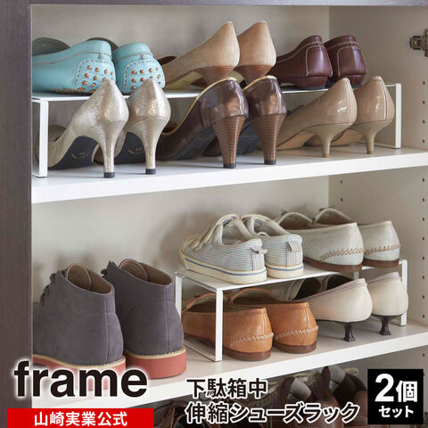 山崎実業 靴 収納 frame フレーム 下駄箱中 伸縮シューズラック ホワイト 2個セット 2572 | 省スペース 2段 棚 大容量 玄関収納 シューズボックス ラック くつ シンプル 白 黒