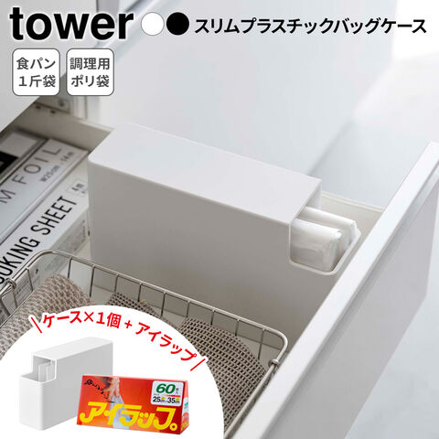山崎実業 岩谷マテリアル tower タワー スリムプラスチックバッグケース & 岩谷 アイラップセット ホワイト 3976 | ポリ袋 収納ケース ゴミ袋 パン袋 防臭袋 ホルダー ストッカー ホワイト 3976 ブラック 3977 パン 一斤 整理 収納 キッチン 白 黒