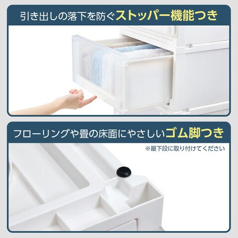 前倒れ防止機能つき積み重ねて引き出しを引いた時の前倒れを防ぐ、前倒れ防止用ジョイント具つき。