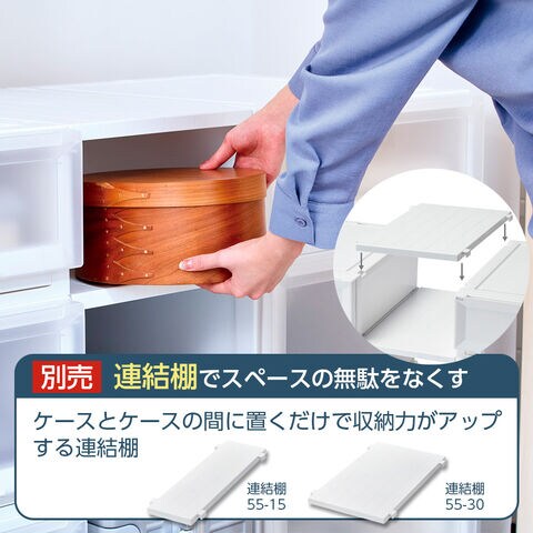 専用棚(別売)別売の専用棚「フィッツケース アドバンス 連結棚 55-15」「フィッツケース アドバンス 連結棚 55-30」をケースとケースの間に取り付ければ、収納棚になります。