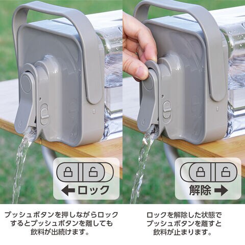 便利なロック機能で飲料を出したままにプッシュボタンを押しながらロックすると、プッシュボタンを離しても飲料が出続けます。