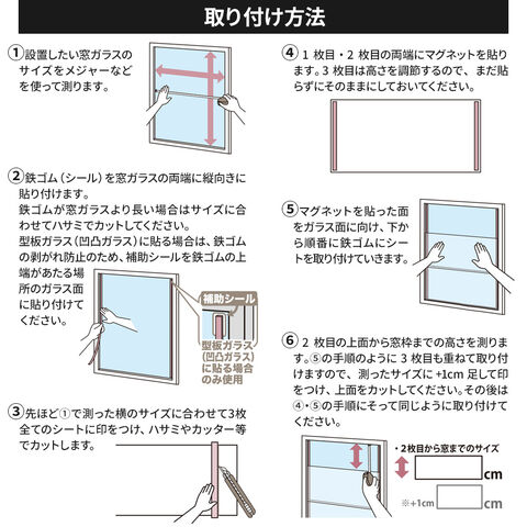取付け簡単窓にスチールシール(鉄ゴムシール)を貼り、シートにマグネットシールを貼って取り付けるので、ガラスに全面を貼るタイプのシートとは違い、シワや気泡を気にしなくてもいい。