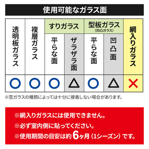 使用可能なガラス面透明板ガラス、複層ガラス、すりガラス(平らな面)、型板ガラス(平らな面)。 ※すりガラス・型板ガラス共に、ザラザラ面・凹凸面は十分に接着しない場合があります。
