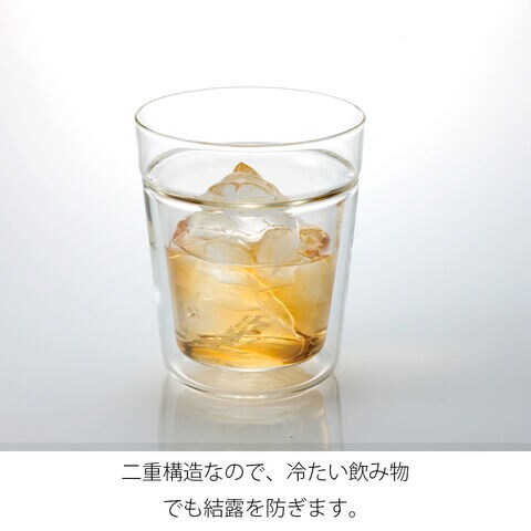 熱い飲み物を入れても持ちやすく、冷たい飲み物は結露を防ぐ、二重ガラスのロックグラス2個セット。