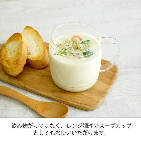 いろんな飲み物に耐熱ガラス製なので、ビールなどのお酒はもちろん、温かいホットドリンク、レンジ調理でスープカップとしてもお使いいただけます。