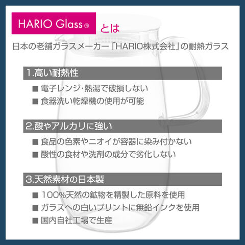 こだわりの「HARIO Glass」製高い耐熱性と耐薬品性を誇り、医学・理化学の分野でも安全性が評価されている耐熱ガラス「HARIO Glass」を使用。