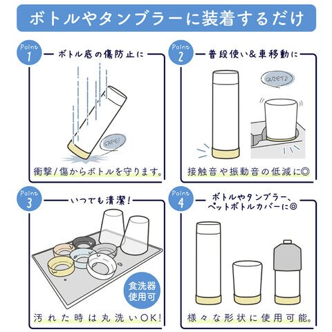 水筒だけでなく、マグカップやタンブラーの底につけて、テーブルに置くときの音や振動も防げます。