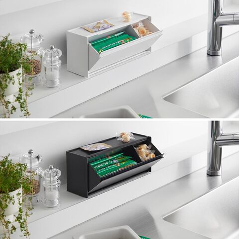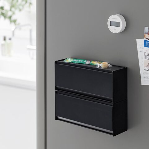 マグネットで壁面収納できるフラップ式のおやつケース。