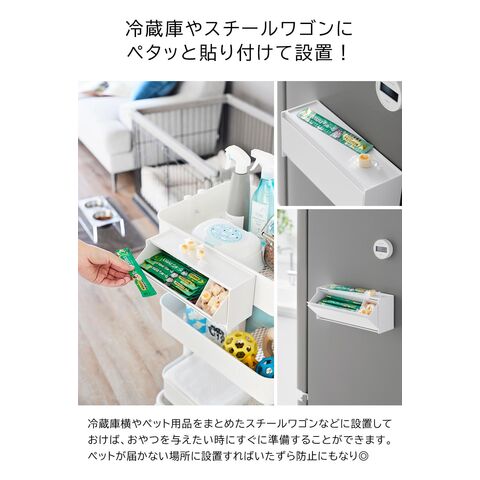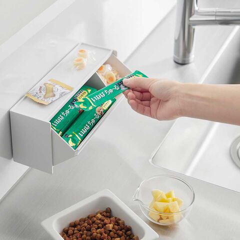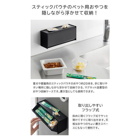 愛犬や愛猫に毎日与えるスティックパウチのおやつを約20本、手に取りやすい場所に隠しながら収納できる、マグネット設置型のおやつ収納ケースです。