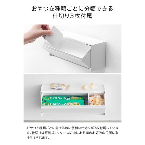 ケースはフラップ式で簡単に開閉でき、おやつの分類に便利な仕切りが3枚付属しています。