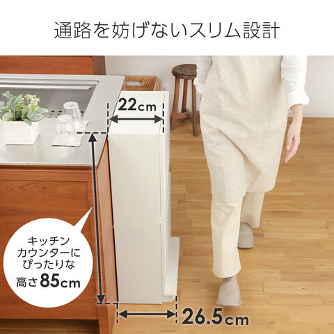 キッチンサイドや壁際に置いても通路を妨げない、薄型分別ストッカー。