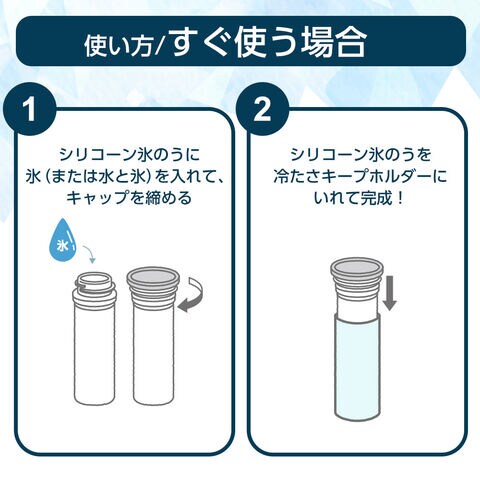 使い方(しっかり凍らせて使う場合)シリコーン氷のうに水をいれてキャップをしめ、そのまま冷凍庫で凍らせて完成です。