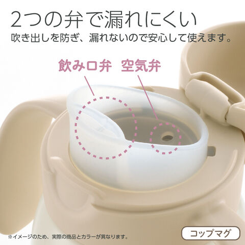 コップマグは2つの弁で噴き出しを防ぎ、漏れないので安心して使えます。※「漏れない」とは誤使用、空気弁の破損や経年劣化による場合などを除きます。なお、本品は完全密封ではありません。カバーを開いた状態で、横倒しで数分間放置したり、振ったりすると中の飲み物が漏れる可能性があります。