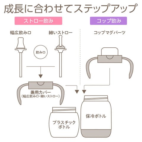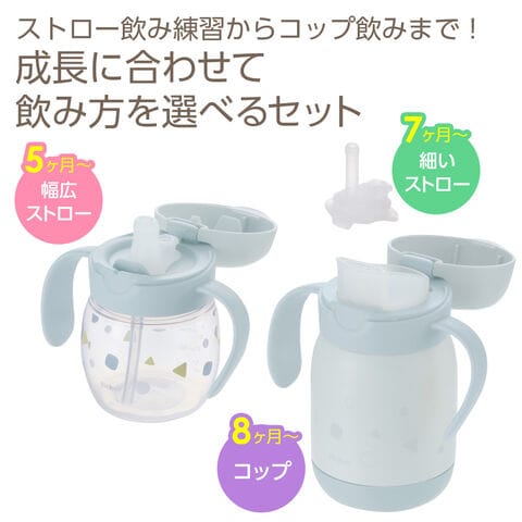 パーツを付け替えて、ストローの練習からストロー飲み、コップ飲みへステップできるマグセットです。