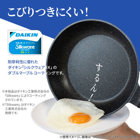 こびりつきにくい!フライパンの内面はこびりつきにくく、耐摩耗性に優れた「シルクウェアEK」のダブルマーブルコーティングです。