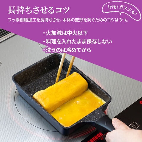 毎日のお料理の強い味方!とっても軽い、ガス火もIHクッキングヒーターも使える卵焼きフライパン【13×18cm】。