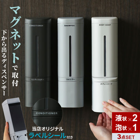 hover 下から出るマグネットディスペンサー リキッド2個+泡 セット 500ml | シャンプーボトル 詰め替え 泡用 ボディーソープ 磁石 で付く 入れ替え 液体 ボトル 容器 ポンプ プッシュ ボタン 風呂 壁面 浮かせて 浴室 トリートメント リンス ミッフィー ボリス