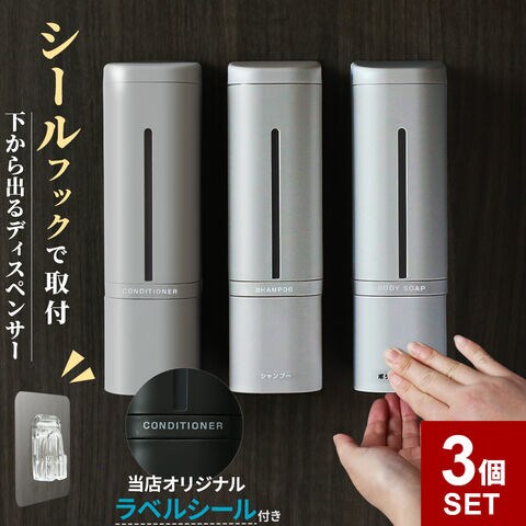 hover 下から出るシールフックディスペンサー リキッド 3個セット 500ml | シャンプーボトル 詰め替え 泡用 入れ替え 液体 ボトル 容器 ポンプ プッシュ ボタン 風呂 壁面 浮かせて 浴室 トリートメント リンス