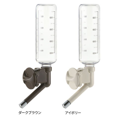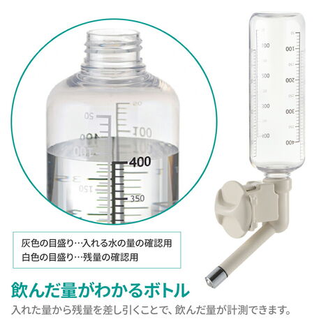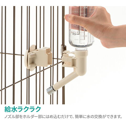 ケージ・サークルに取り付けて使用する、ボトル付きのノズルタイプの給水器。