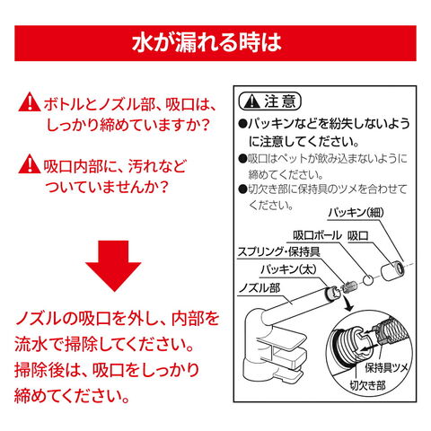 水漏れする場合、ノズル部の吸口を外し内部を流水で掃除してください。掃除後は、吸口をしっかり締めてください。