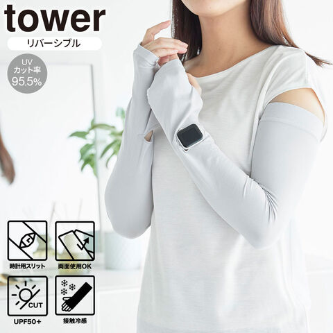 山崎実業 tower タワー リバーシブルで使える アームカバー ライトグレー 10211 | UV 冷感 ロング 両面使える uvカット 紫外線対策 日焼け防止 接触冷感 ロング丈 二の腕まで ガード スリット 腕時計 スマートウォッチ 付けたまま 洗濯機OK シンプル