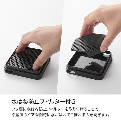 水はね防止フィルターでドア開閉時も安心フタ裏についた水はね防止フィルターが、表面張力で容器内のお茶を受け止めます。
