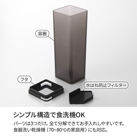 シンプル構造で食洗機OKパーツは、容器・フタ・水はね防止フィルターの3つだけ。全て分解できるので、お手入れしやすいです。