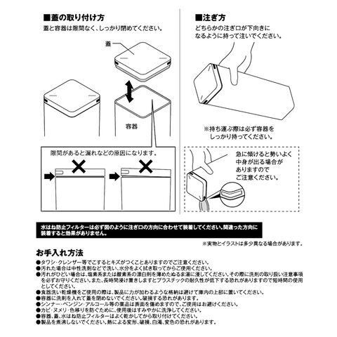 水はね防止のパーツは水はねを完全に防ぐものではありません。装着しても、強い揺れや角度によっては中身が漏れる場合があります。