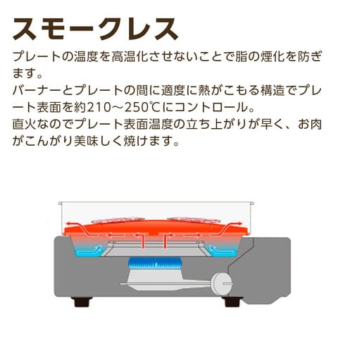 バーナーとプレートの間に適度に熱がこもる構造でプレート表面を約210~250℃にコントロール。直火なのでプレート表面温度の立ち上がりが早く、お肉がこんがり美味しく焼けます。