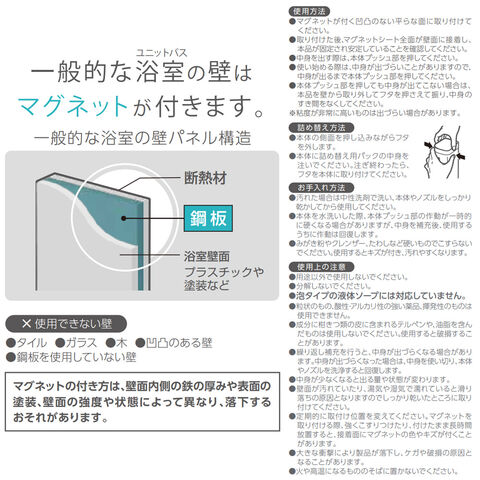 マグネットで取り付けマグネットの付く浴室壁に設置できます。お好みの場所にペタッと取り付けるだけのカンタン設置。
