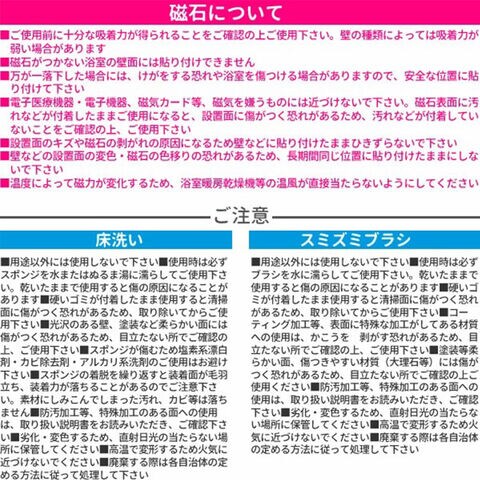 ご注意磁石が付かない浴室の壁面には貼り付けできません。ご使用前に十分な吸着力が得られることをご確認の上、ご使用下さい。