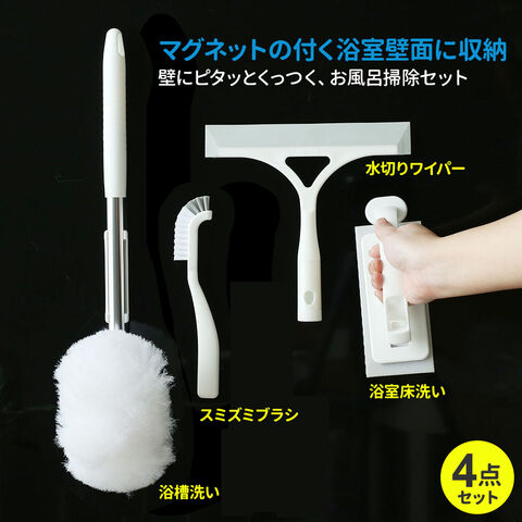 材質:【共通】ゴム磁石 【浴槽洗い】ヘッド・ブラシ/ポリプロピレン 柄/アルミ 【床洗い】スポンジ/ポリウレタン ブラシ/ナイロン・ポリエステル 【ワイパー】グリップ/ポリプロピレン 水切りゴム/合成ゴム 【スミズミブラシ】ブラシ/PET・ナイロン