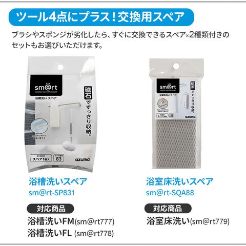 アズマ工業 マグネットで付く お風呂掃除道具 4点+スペア2点セット(浴槽洗いFM+床洗い+水切りワイパー+スミズミブラシ) sm@rt777・779・764・781・SQA88・SP831