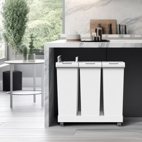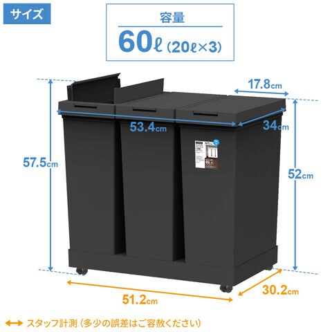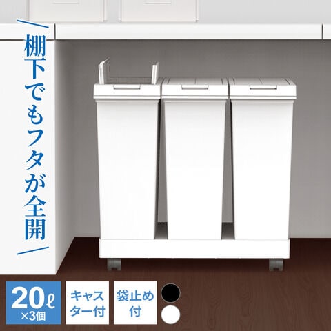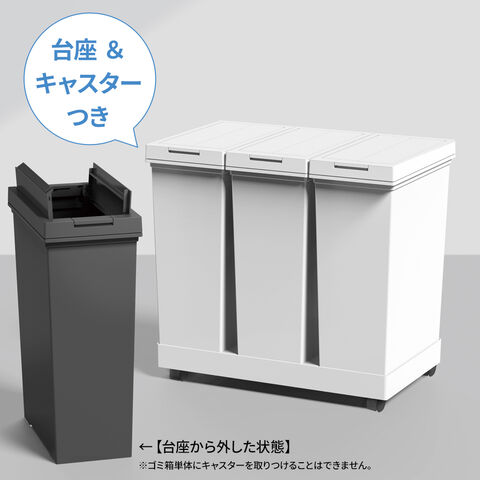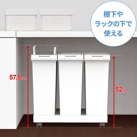 両開きフタで、棚下で使える台座&キャスター付きのプッシュ式ダストボックス 60L(20L×3個)。