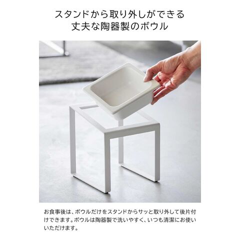 丈夫で洗いやすい陶器製のボウルは、傾斜をつけてスタンドにセットでき、腰や首に負担をかけず、ラクな姿勢で食べられます。
