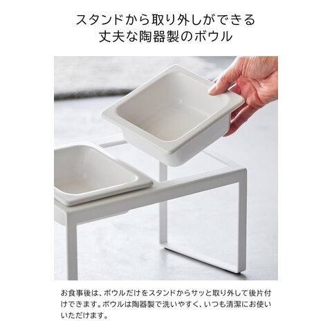 丈夫で洗いやすい陶器製のボウルは、傾斜をつけてスタンドにセットでき、腰や首に負担をかけず、ラクな姿勢で食べられます。